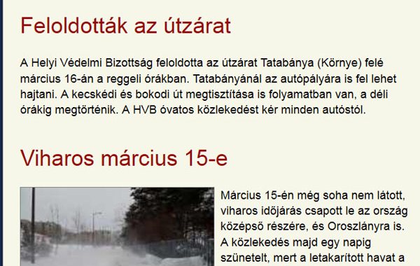 Eltelt szépen a 15-e, majd szombaton délelőtt jött a verőfényes napsütés, a csalóka melegedés, s talán ennek hatására döntött úgy a helyi Védelmi Bizottság, hogy délelőtt 10 óra magasságában közzéteszi: A Helyi Védelmi Bizottság feloldotta az útzárat Tatabánya (Környe) felé március 16-án a reggeli órákban. Tatabányánál az autópályára is fel lehet hajtani. A kecskédi és bokodi út megtisztítása is folyamatban van, a déli órákig megtörténik. A HVB óvatos közlekedést kér minden autóstól. (kép mellékelve)