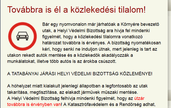 A hóhelyzet miatt kialakult jelenlegi állapotban a legfontosabb az utak takarítása, megtisztítása, az elakadt járművek műszaki mentése. A Helyi Védelmi Bizottság felhívja mindenki figyelmét, hogy az útzár továbbra is érvényben van! A Katasztrófavédelem és a Rendőrség adhat, helyi szinten felmentést, az egyes érintett járművek vonatkozásában. Mindenkit megértünk, hogy haza szeretne jutni, de még egy kis türelmet kérünk!